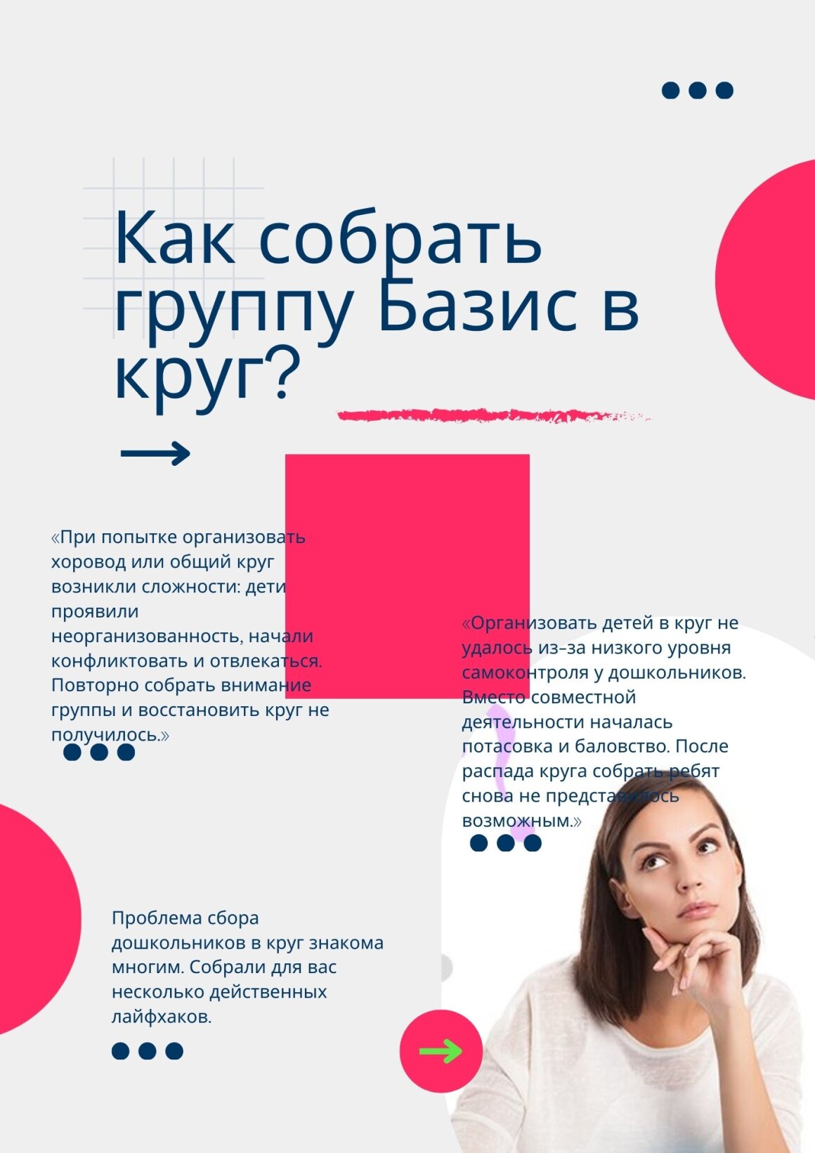 Ваше спокойствие, предсказуемость и позитивный настрой — главный регулятор групповой динамики. Если вы в ресурсе и ведете группу как уверенный «капитан корабля» через заранее подготовленные ритуалы и игры, дети чувствуют опору и следуют за вами.