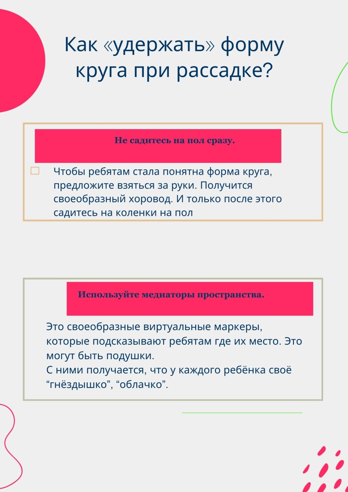 Четкое зонирование пространства: «Это наш ковер для круга, это — поле для подвижной игры, это — столы для творчества».